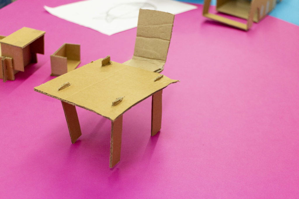 Wir haben verschiedene multifunktionale >> Möbelmodelle gebaut aus Karton, denn wir alle sechs Trainees hatten viele verschiedene Ideen Möbelmodelle zu bauen.